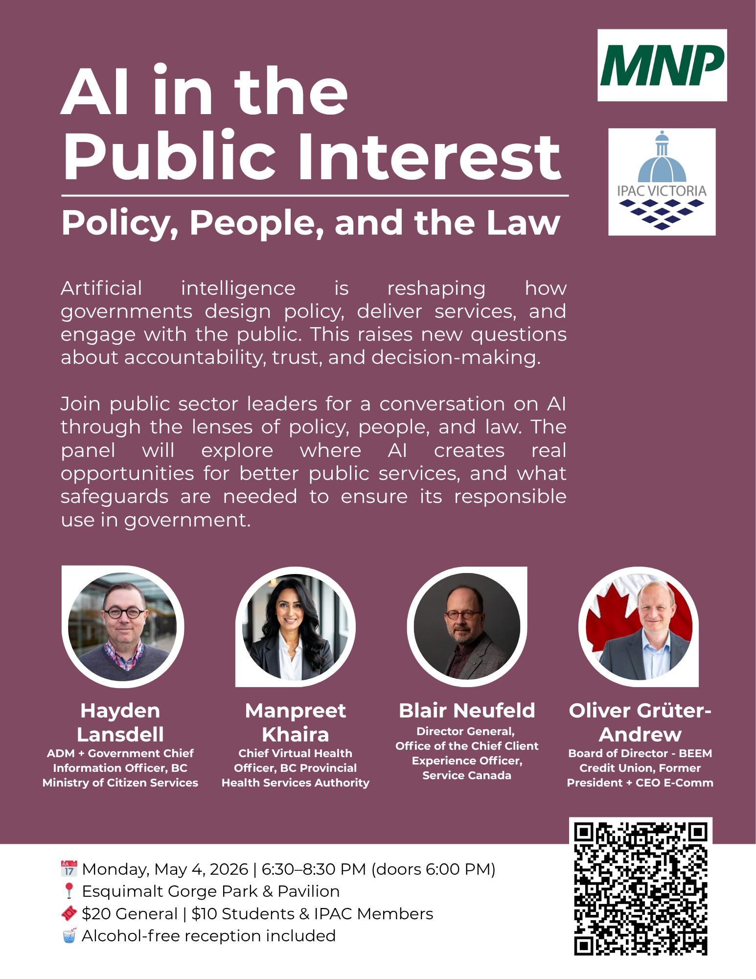 This panel brings together leaders from across the public sector to examine AI's implications through three interconnected lenses — policy, people, and law. Together, they will explore where AI creates real opportunity for better, more responsive public services, and where it introduces risks that institutions must confront head-on.