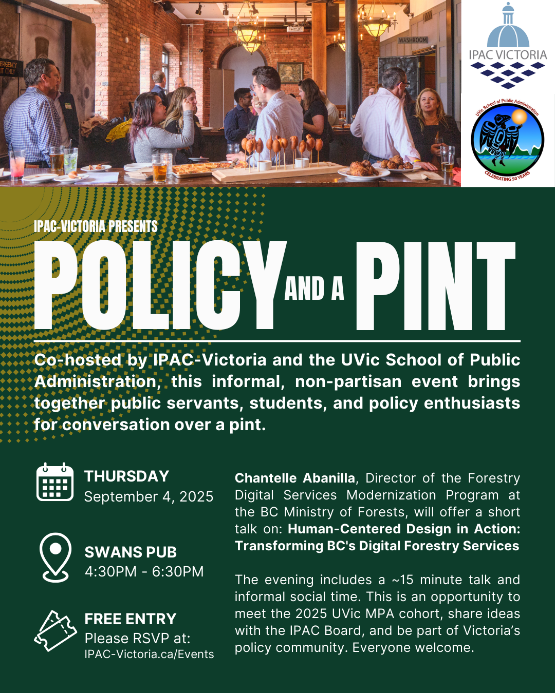 This event is hosted in partnership with the UVic School of Public Administration and is a unique opportunity to meet the incoming cohort of MPA students for fall 2025. Come meet fellow public servants, the IPAC-Victoria Board, share your ideas for future events, and connect with a growing network of policy-minded folks in Victoria.